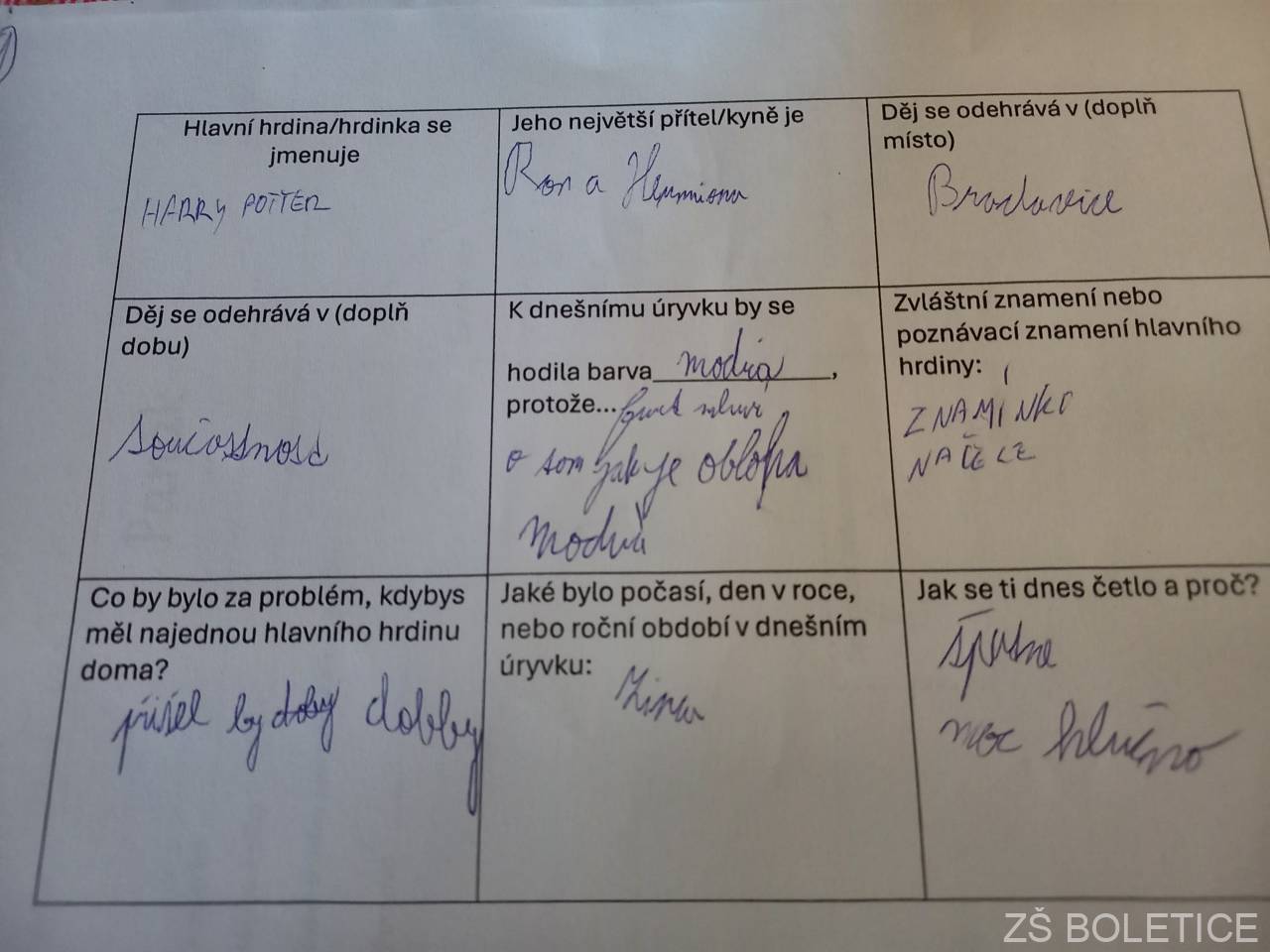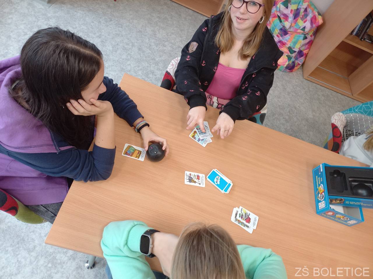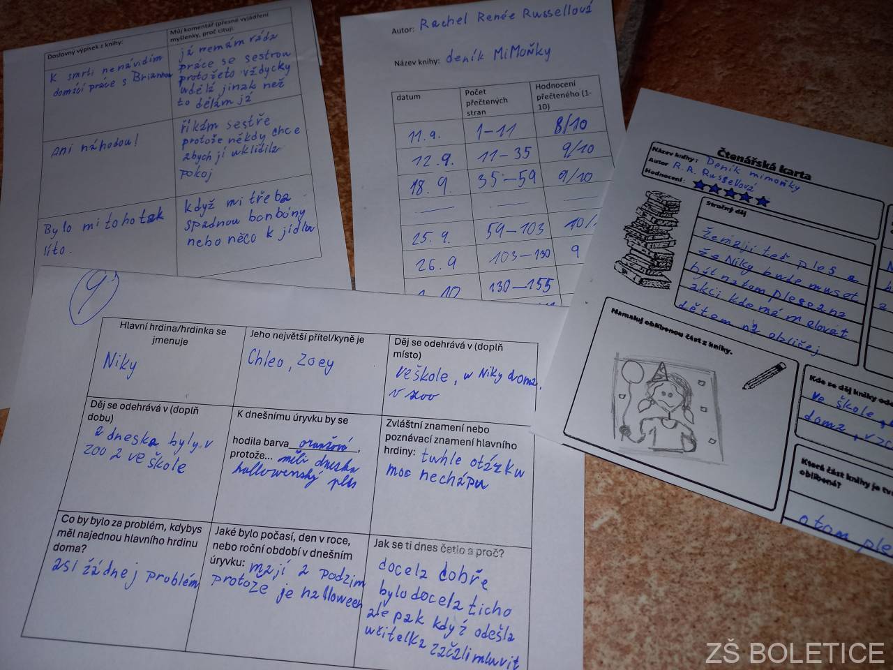 V průběhu měsíce září a října opět proběhlo 10 lekcí čtenářských dílen na 2. stupni. Žáci se začetli do knih podle svého výběru, plnili úkoly rozvíjející porozumění textu. Ke čtení jsme využili novou knihovnu na 1. patře, někomu vyhovovalo čtení ve třídě, jiní si hledali své místečko jinde. Mám radost, že především u sedmáků byl patrný pokrok oproti loňsku – jak ve výběru knih sobě na míru, tak v porozumění čtenému. Výsledkem byly i vizuálně pěkně vyplněné čtenářské organizéry se zajímavými poznámkami. Knihovnu jsme v závěru dílen využili i k hraní společenských her, které mají žáci k dispozici i během velkých přestávek. L. Šikýřová