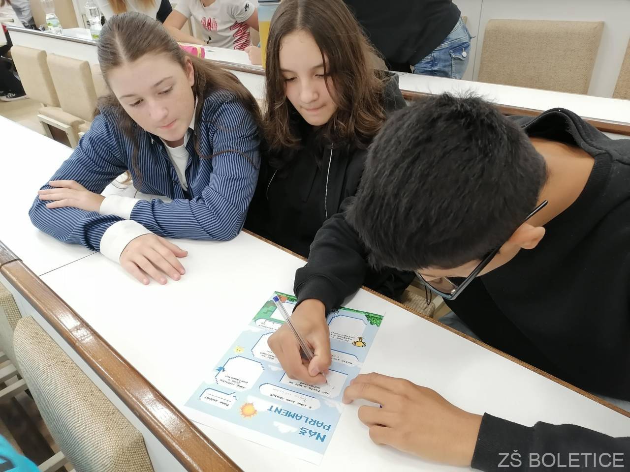 Zástupci našeho školního parlamentu se v úterý 14. října zúčastnili setkání se členy parlamentů z jiných škol. Během schůzky na děčínském magistrátu jsme společně plnili pracovní listy a následně jsme své výsledky a postupy nahlas prezentovali ostatním. Díky tomu jsme mohli porovnat, jak fungují ostatní školní parlamenty, což pro nás bylo velmi inspirativní. Setkání nám přineslo mnoho nových nápadů. V. Podroužková, P. Šimková